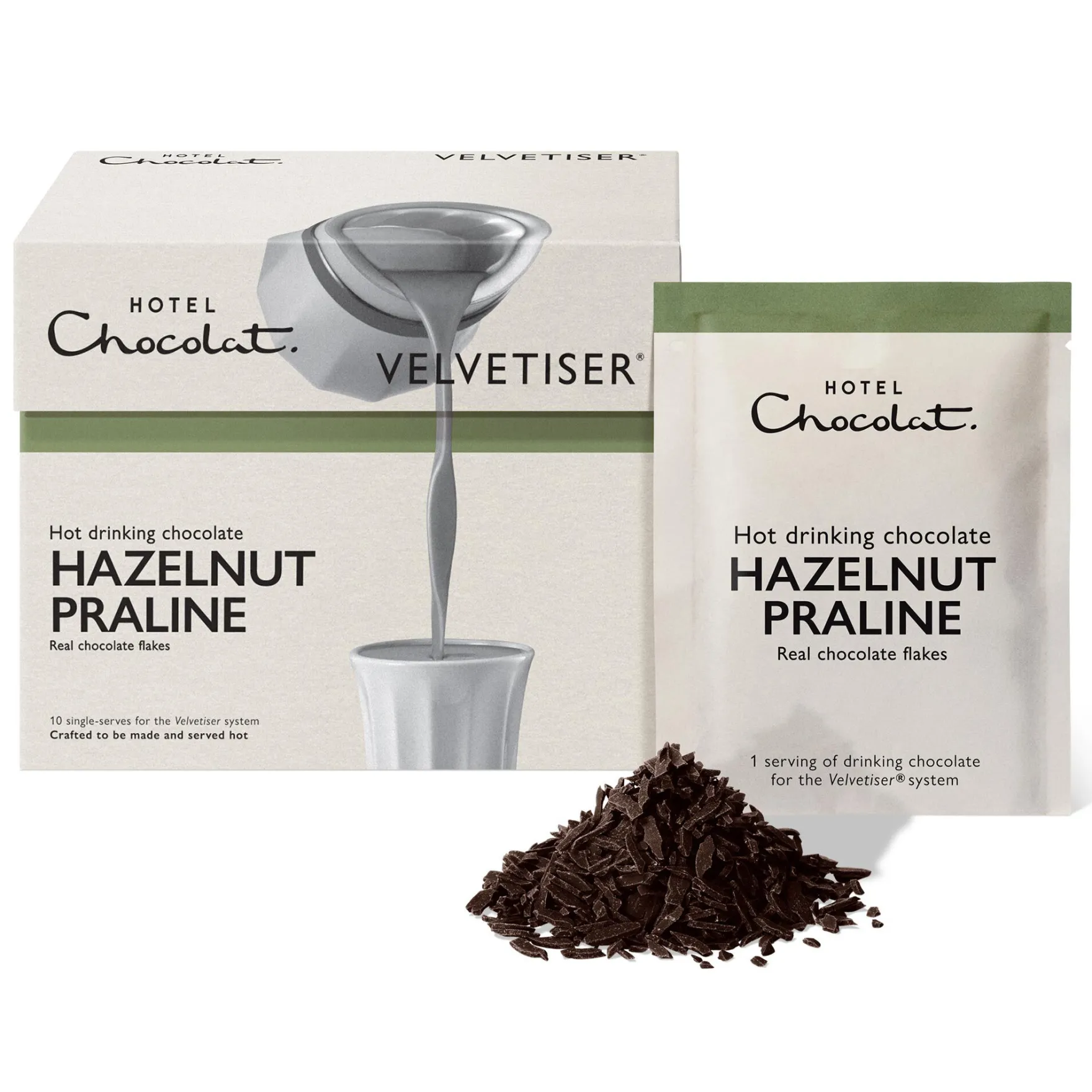 These 10 Hazelnut Praline hot chocolate sachets are perfectly portioned for your Podcup™ and made to work harmoniously with the Velvetiser* – the complete system for hot and cold barista-grade drinking chocolate. It’s the only way to get that velvet-smooth texture and that coveted chocolate crema.