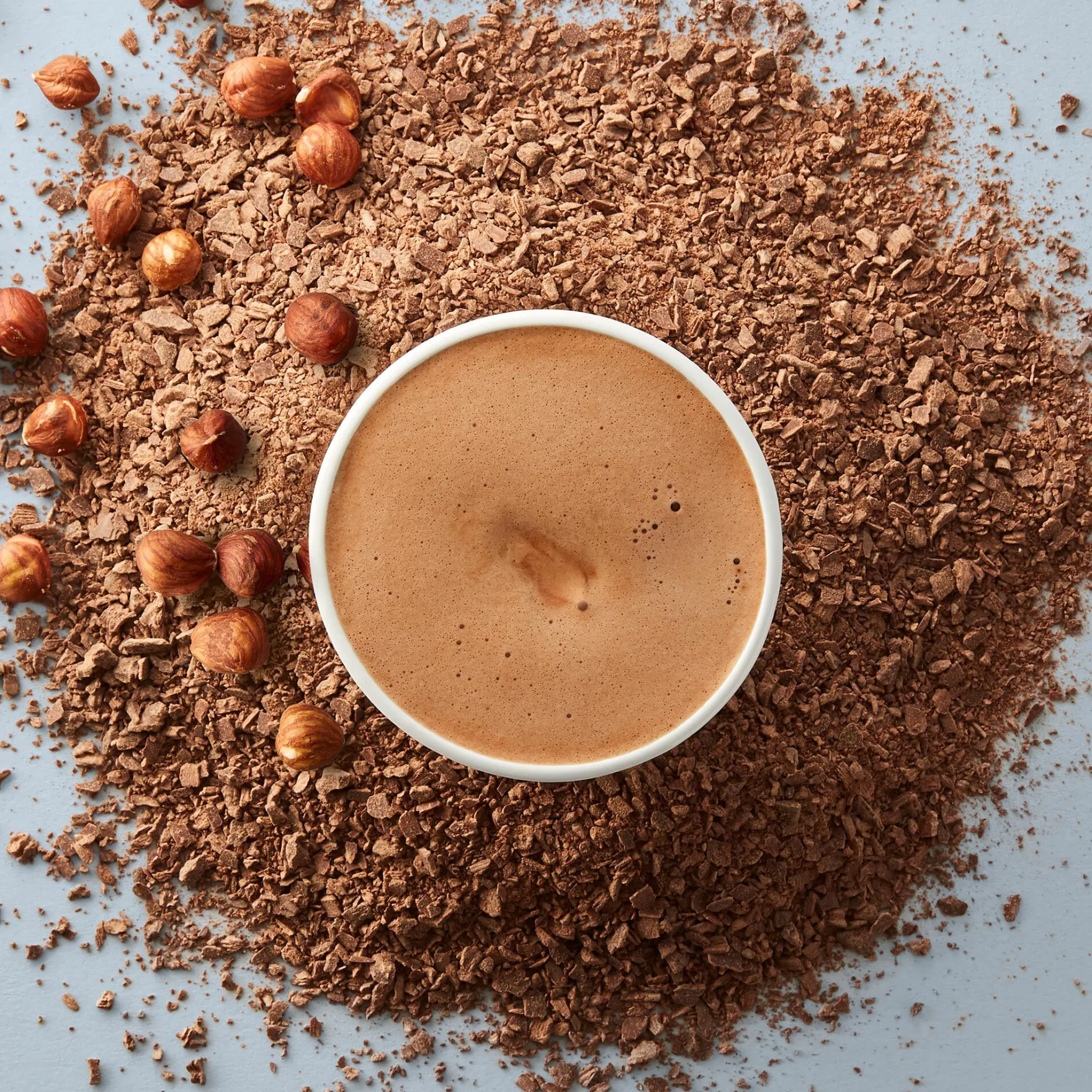 We grind whole hazelnuts until smooth and swirl them into our signature 70% dark chocolate for a silky texture with all the nuances of high-cacao chocolate. As with all our recipes, this hazelnut hot chocolate is crafted with real chocolate flakes according to our mantra: ‘more cacao, less sugar’.